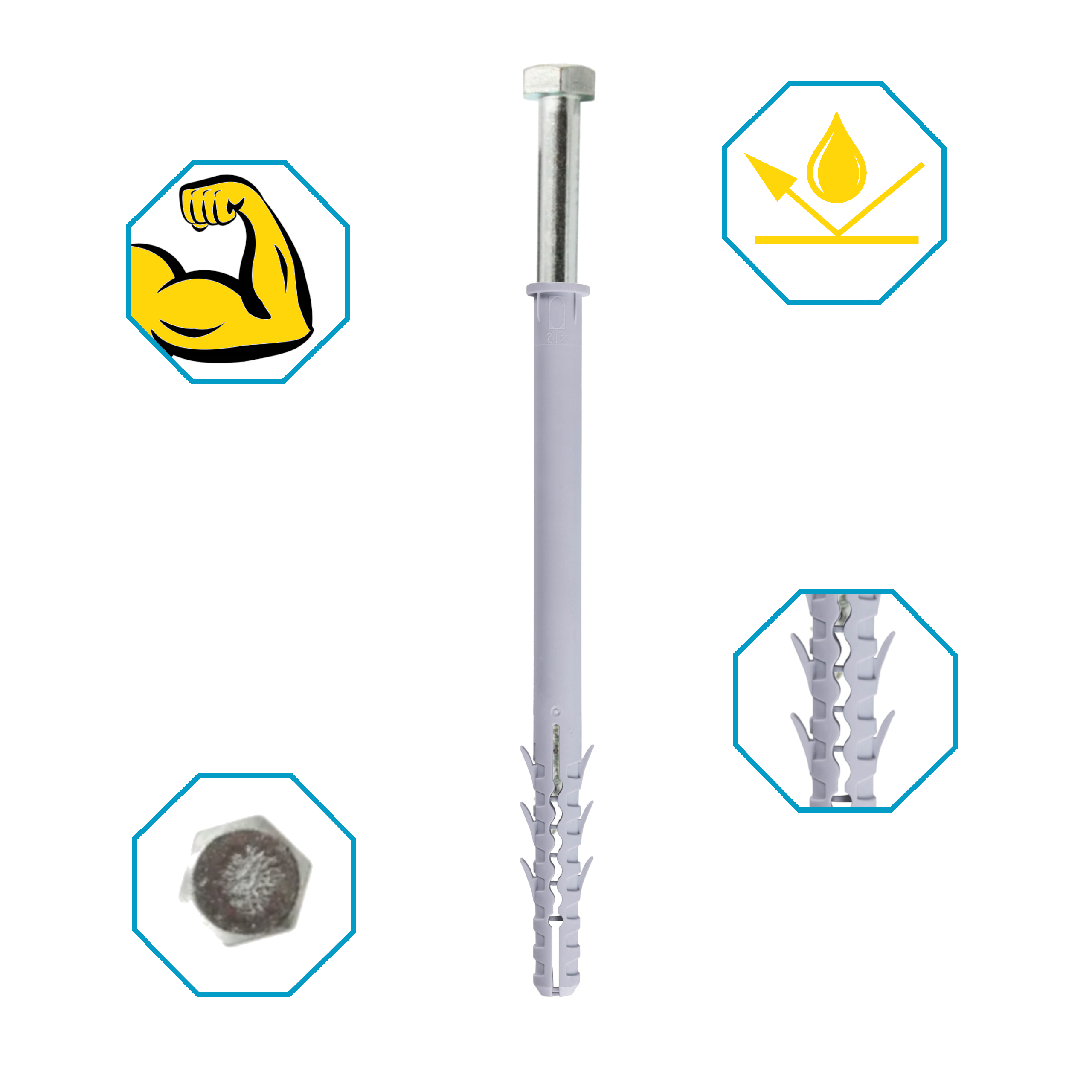 Solidny element mocujący zaprojektowany do pewnego i trwałego montażu w różnych materiałach budowlanych. Wyposażony w sześciokątny łeb oraz wkręt o średnicy 8 mm i długości 165 mm, zapewnia szybki montaż i wysoką stabilność. Kołek wykonany z odpornego polipropylenu, przeznaczony do stosowania wewnątrz pomieszczeń. Doskonały do mocowania balustrad, ogrodzeń, instalacji rur oraz konstrukcji stalowych.