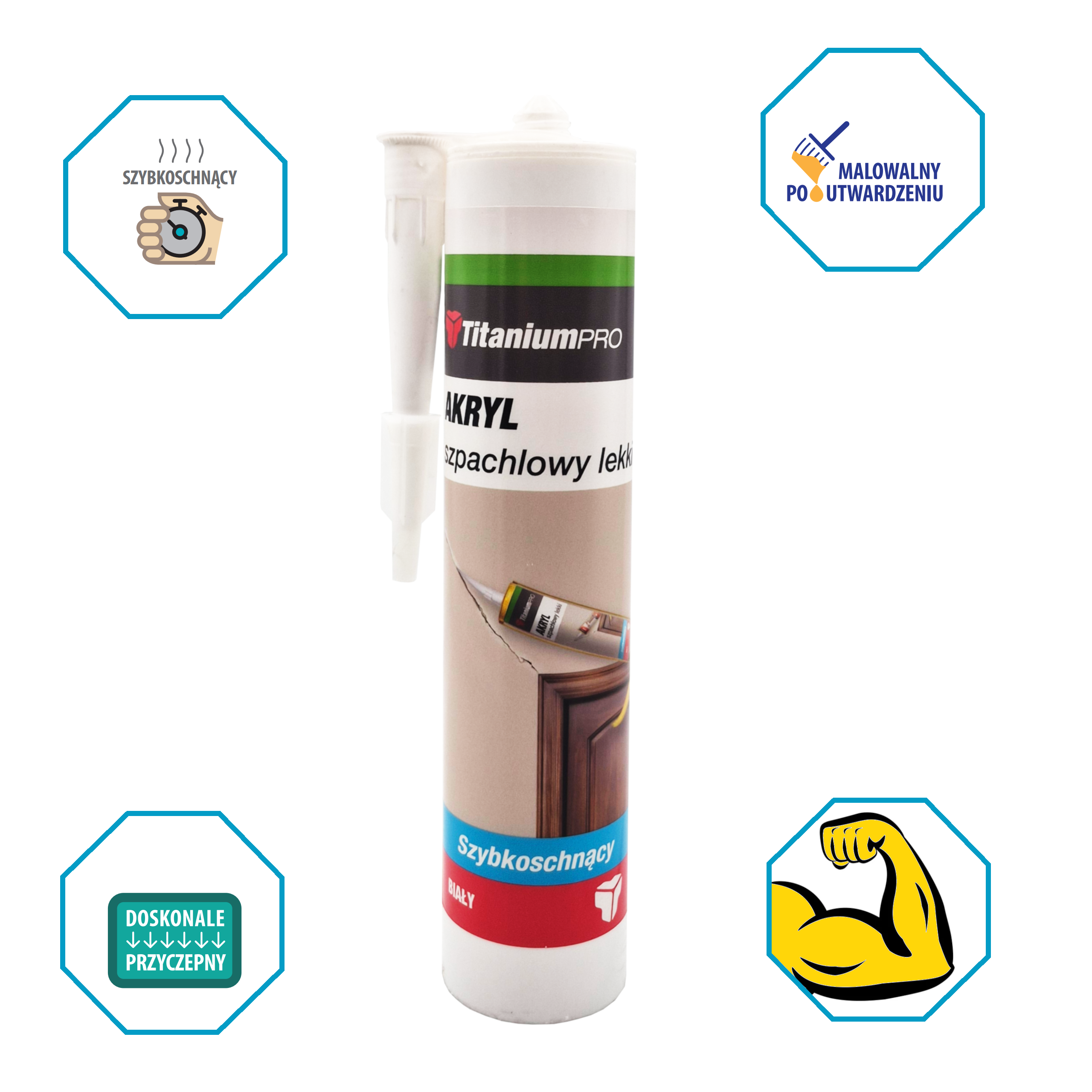 Profesjonalny, lekki akryl szpachlowy Titanium Pro to doskonałe rozwiązanie do szybkich i trwałych napraw w domu oraz budownictwie. Dzięki innowacyjnej formule jest niezwykle łatwy w aplikacji, a po wyschnięciu tworzy gładką, białą powierzchnię, gotową do malowania.