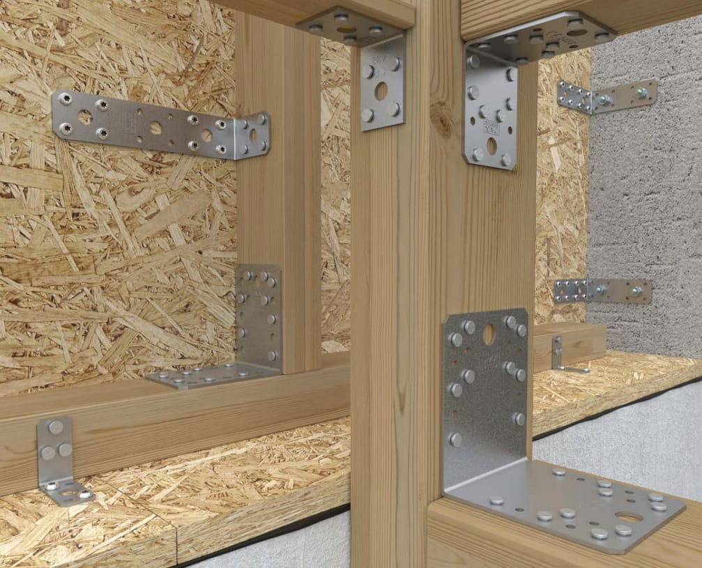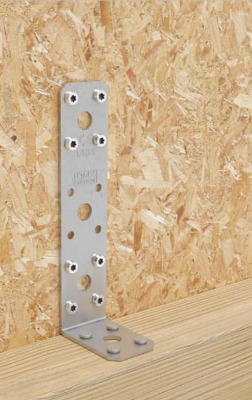 Podstawowe kątowniki do łączenia drewna z drewnem, betonem lub stalą. Różne wielkości otworów zwiększają ich uniwersalność i umożliwiają montaż na różnych radzajach łączników trzpieniowych.