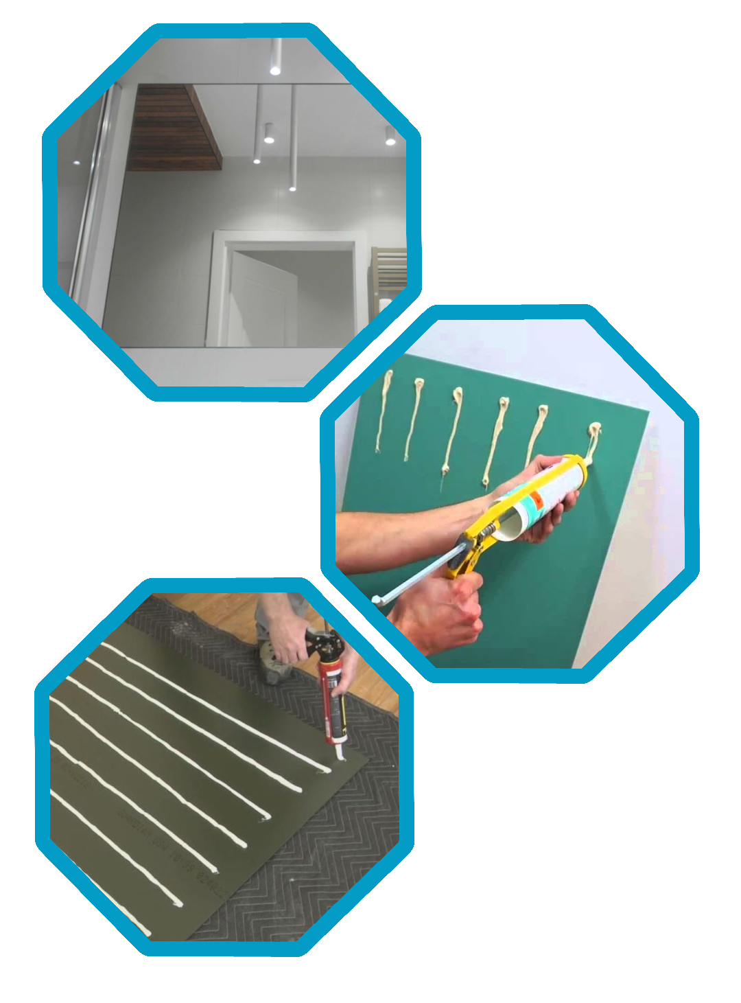Aplikacja kleju: Nałóż klej na powierzchnię lustra lub podłoża w postaci pionowych pasków w odstępach 10–20 cm.