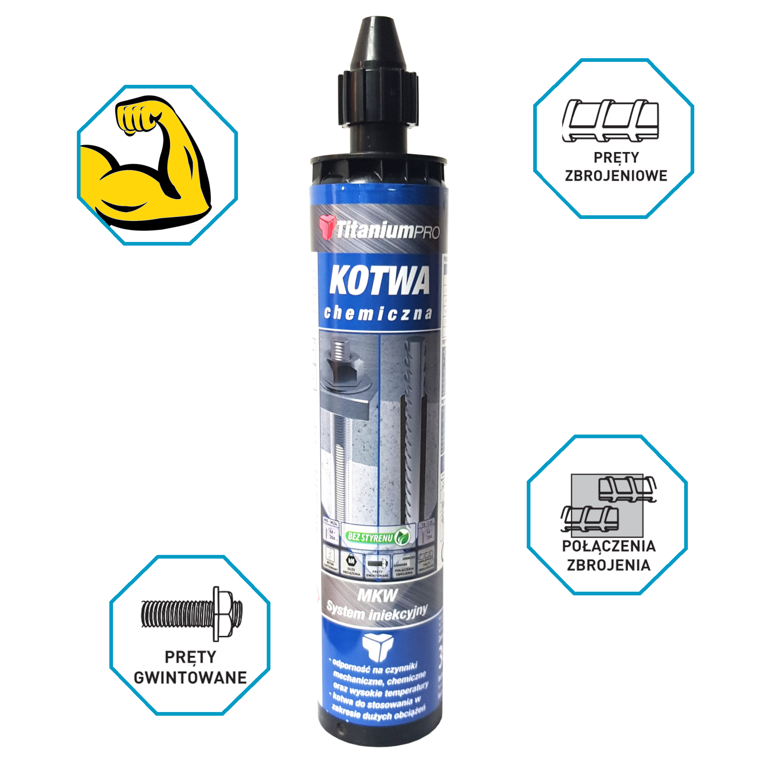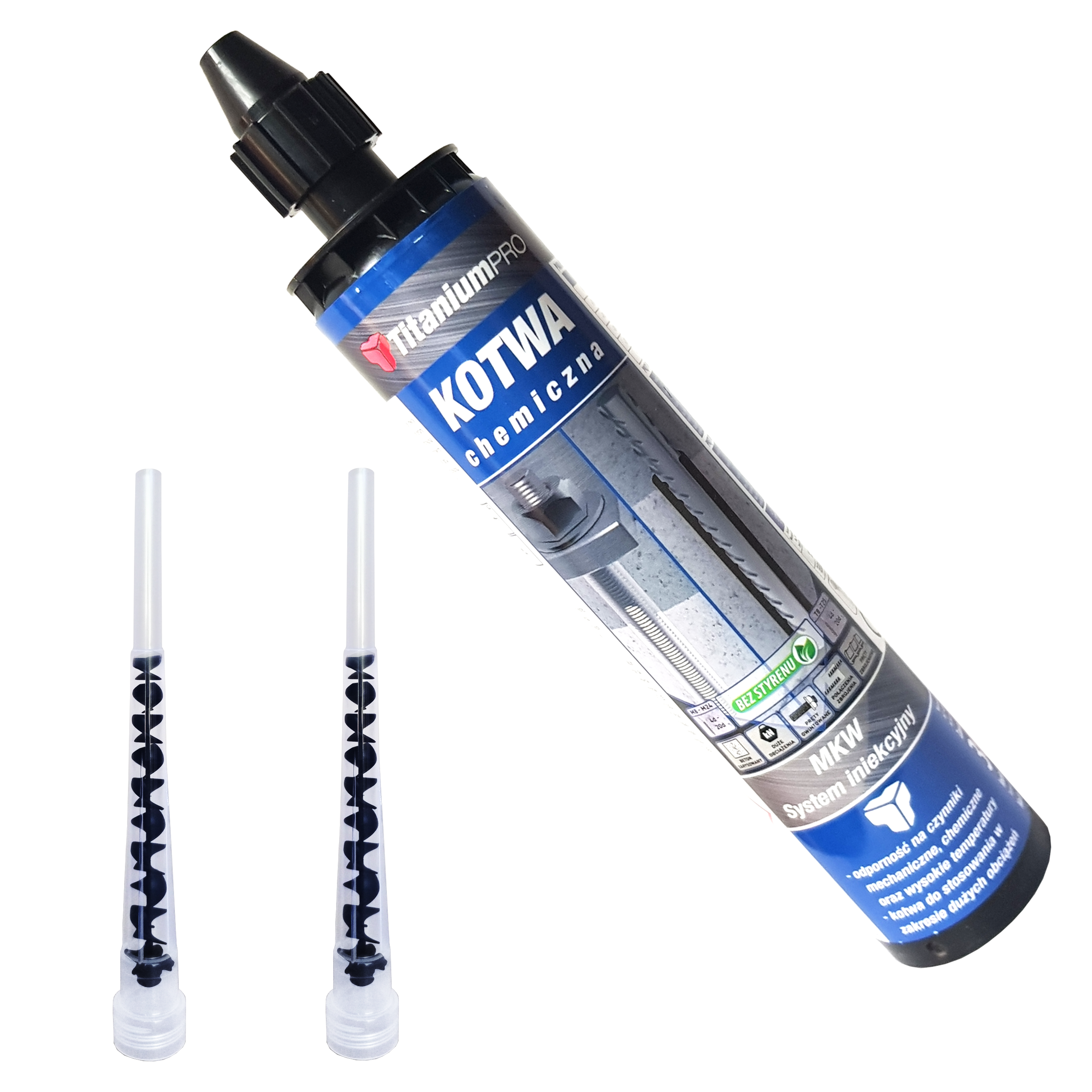 Dwukomponentowa kotwa chemiczna na bazie bezstyrenowej żywicy winyloestrowej. Szeroki zakres prętów gwintowanych M8 do M24 w klasach 5.8 do 10.9 pozwala na montaż w betonie niezarysowanym. Możliwość stosowania w betonie niezarysowanym oraz zarysowanym - przy naprawach konstrukcji. Stosowana w podłożu suchym, wilgotnym oraz w otworach zalanych całkowicie wodą. Nie zawiera związków styrenu możliwość bezpiecznego stosowania w zamkniętych pomieszczeniach.