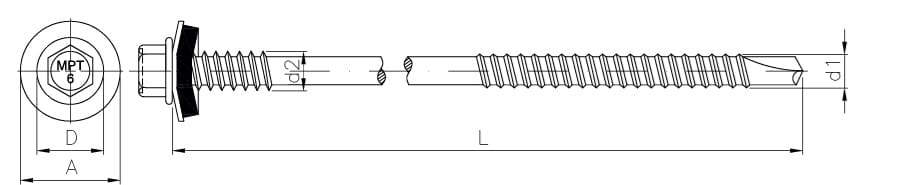 Wkręt samowiercący 6,3/5,5×105 mm z podkładką 19 mm przeznaczony do montażu płyt warstwowych o grubości 50–80 mm. Końcówka wiercąca umożliwia szybki montaż bez wstępnego nawiercania, a sześciokątny łeb z podkładką uszczelniającą zapewnia trwałe i szczelne połączenie. Powłoka antykorozyjna chroni przed działaniem czynników atmosferycznych.