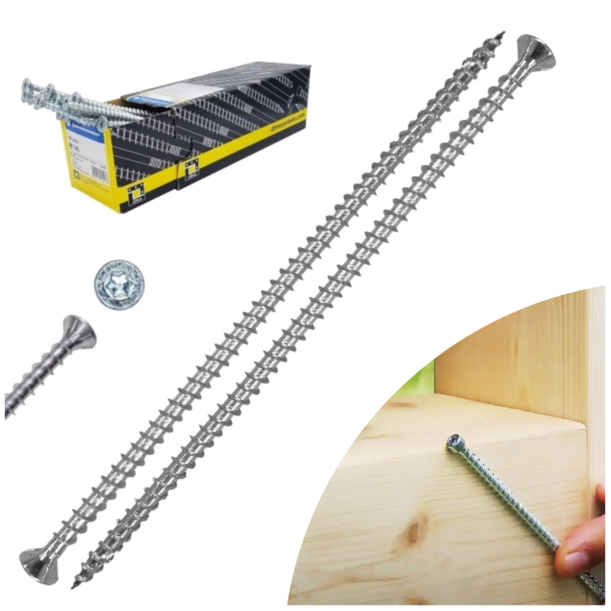 Pełny gwint na całej długości trzpienia zapewnia bardzo silne ściąganie elementów i zwiększoną nośność połączenia. Łeb stożkowy umożliwia estetyczne zagłębienie w drewnie, a gniazdo TORX gwarantuje stabilne prowadzenie bitu, zmniejszając ryzyko uszkodzenia łba i poprawiając komfort pracy przy długich wkrętach.